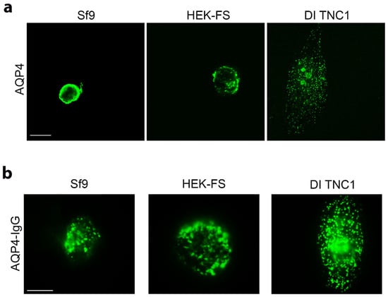 The OAP-forming human M23-AQP4 was expressed in Sf9 insect cells, in human embryonic kidney HEK-FS cells and in astrocyte DI TNC1 cells. Sf9 and HEK-FS are widely used for large-scale protein production, while DI TNC1s are rat astrocyte-derived cells. AQP4 expression and localization was evaluated by immunofluorescence (IF) with anti-AQP4 antibody. Confocal analysis of stack section showed a weak intracellular staining in mammalian cells compared to that observed in insect cells (Figure 1a). In particular, Sf9 cells appear to include a circular fluorescence within the cytosol immediately below the membrane level. This may be due to the swelling of the nucleus and other compartments such as ER that occurs in insect cells following baculovirus infection. DI TNC1 shows typical plasma membrane punctate staining while intracellular staining is not appreciable also because DI TNC1s are very thin cells (3–4 μm in thickness).