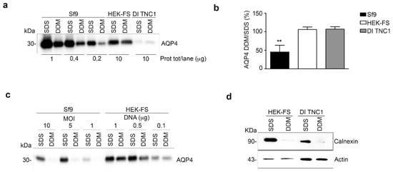 Analysis of AQP4 folding in insect and mammalian cell lines. (a) Western blot of AQP4 solubilized from whole insect (Sf9) and mammalian cells (HEK-FS and DI TNC1) using two different detergents (SDS and DDM) and probed with an anti-AQP4 antibody. Three different amounts of total protein are shown for the Sf9 cell line, while a higher amount of total protein is shown for mammalian cells, as indicated. (b) Histochart of Western blot data reported in a showing the percentage of DDM-solubilized AQP4 (DDM/SDS (%)), determined by comparing the amount of AQP4 in the DDM-solubilized fraction to the amount of AQP4 in the SDS-solubilized fraction. Data are plotted as mean ± SEM (** p < 0.005, n = 3). (c) Immunoblot detection of AQP4 content in SDS and DDM-solubilized fraction from insect and mammalian cells infected/transfected using different infection/transfection condition as indicated in each lane. (d) Immunoblot detection of Calnexin containing SDS and DDM-solubilized fraction from whole HEK-FS and DI TNC-1 cells. Actin was used to normalize for equal loading.