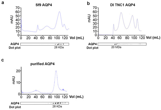 To evaluate supramolecular features of recombinant AQP4 and the post-extraction integrity of OAPs, DI TNC1-, HEK-FS-, and Sf9-M23-AQP4 expressing cells were extracted by DDM in native conditions the soluble fraction was analyzed by 13% SDS-PAGE followed by 3–9% gradient BN-SDS/PAGE (2DE) and by AQP4 immunoblotting. 2DE analysis showed that high molecular weight OAPs were present in the total extract obtained from DI TNC1 and were less abundant in HEK-FS extract. Notably, Sf9 total extract contained mainly tetramers and the lower molecular weight (MW) AQP4 pool (Figure 3). To exclude the possibility that total protein extract from Sf9 cells contained mainly an AQP4 pool deriving from ER where AQP4 resides in tetrameric form [], plasma membrane-enriched fractions were prepared from Sf9- and DI TNC1-M23-AQP4 expressing cells as already reported []. Vesicle extracts obtained were subjected to high-resolution size exclusion chromatography (nSEC) and the AQP4 level in each eluted fraction was estimated by dot blot analysis (Figure 4). Sf9 AQP4 was eluted in a later fraction interval (elution volume of 100 mL) (Figure 4a) compared to DI TNC vesicle extract (elution volume of 40 mL) (Figure 4b) suggesting different OAP-integrity profiles in the cell lines. Interestingly, the elution volume of AQP4 expressed in Sf9 was similar to that observed for purified AQP4 expressed in the same cells (Figure 4c). The results show that the DDM-solubilized fraction from DI TNC1 contains integral post-extraction OAPs, while OAPs are largely disassembled in Sf9 extract. These data, in agreement with those obtained with 2DE, confirm the different plasma membrane behaviour of AQP4 in mammalian compared to transfected insect cells.