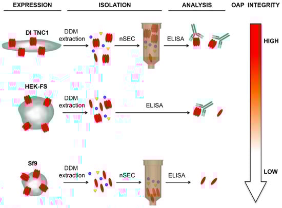 Data here reported suggest that the detergent is just one of the fundamental variables. Despite having used the DDM here, the most successful detergent for alpha helical containing membrane protein isolation for crystallography studies [], we show that the choice of the host-cell type is a pivotal point to isolate integral OAPs.