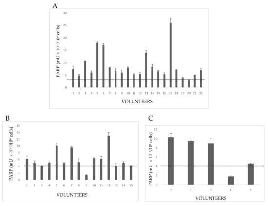 Figure 2A). A number of these volunteers showed PARP activity levels above the cut-off of controls (no growers); in particular, hyperactivation of PARP in Subjects 3,5, 6, 13, and 17 spanned from three to six times the upper physiological limit determined for not exposed people (4 mU × 10