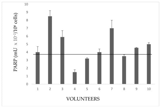 Five volunteers (Group 3E) had neither familiar nor personal pathologies, but three of five subjects showed serious increase of PARP activity (