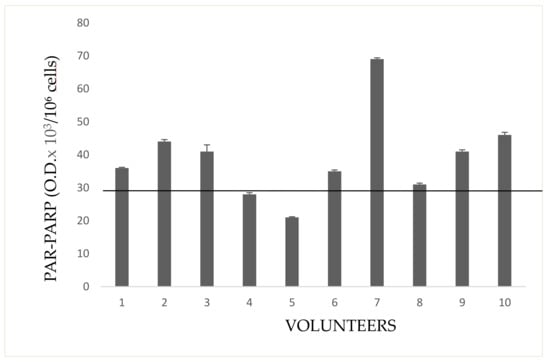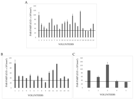 Figure 6A). The other subjects showed PAR-PARP levels corresponding to DNA damage from moderate to excessive; in Volunteers 5, 12, 15, 19, and 22 PARP hyper-modification reached the maximal levels indicating an extensive DNA damage. Such high levels could not be explained on the basis of declared personal pathologies, since other people affected by the same diseases had moderate or even nearly physiological PAR-PARP. As a hypothesis, PARP hyper-modification for Dubjects 5, 12, 15, 19, and 22 might correlate to the years (10–40) of greenhouse frequency.