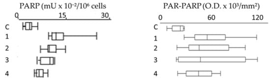 The data of PARP activity and PAR-PARP were checked with a double statistical analysis, the parametric ANOVA test and the non-parametric Mann–Whitney U test.