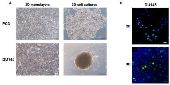 PC3 and DU145 PCa cells cultured in 2D-monolayers displayed a polygonal morphology with tightly apposed cells, consistent with an epithelial phenotype (Figure 1A). When seeded in agarose-coated wells, PC3 and DU145 PCa cells formed 3D aggregates and 3D-spheroids, respectively, evident after 40–72 h. 3D cell cultures containing PC3 cells exhibited an irregular morphology and cells were less densely apposed. In contrast, spheroids containing DU145 cells had a spheroidal regular morphology and they contained densely packed and strongly adhering cells, as previously described [33] (Figure 1A). Since PC3 3D-aggregates did not maintain their integrity during manipulation, immunofluorescence analysis was performed only on DU145 3D-spheroids.