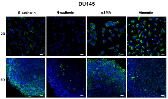 Immunofluorescence analysis of epithelial-to-mesenchymal (EMT) markers in DU145 cells. Micrographs using the confocal microscope showing the epithelial marker E-cadherin and mesenchymal markers N-cadherin, αSMA and vimentin (green) in DU145 cells grown in 2D-monolayers and in 3D-spheroids. Original magnification: 40×. Bar: 20 µm. Blue: DAPI.