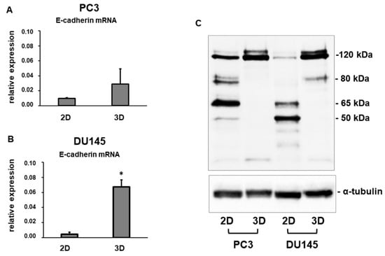 E-cadherin mRNA and protein levels. Bar graphs showing E-cadherin mRNA levels in PC3 cells (A) and DU145 cells (B) grown in 2D-monolayers and 3D cell cultures. Data are means ± SD of duplicate samples. (C) Representative Western blot analysis showing E-cadherin protein levels in whole cell lysates obtained from PC3 and DU145 cells cultured in both experimental conditions. * p < 0.05 vs DU145 2D-monolayer.