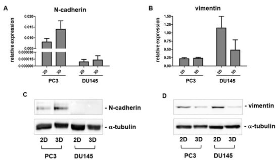 The expression of mesenchymal markers was also analyzed at the mRNA and protein level. According to the morphological analysis, N-cadherin gene expression was higher in PC3 cells while it was very low in DU145 cells cultured in 2D-monolayers (Figure 5A). While its expression was similar in DU145 cultures in 2D and 3D, N-cadherin gene expression was stimulated by 3D arrangement in PC3 cells (Figure 5A). Vimentin showed the opposite gene expression pattern, since it was similar in 2D and 3D cell cultures in PC3 cells, while expressed at a lower extent in DU145 3D compared to 2D cell cultures (Figure 5C). Since mRNA levels are not predictive of protein levels, due to translational and posttranslational regulations, N-cadherin and vimentin protein levels were analyzed. Higher N-cadherin protein levels were detected in PC3 3D-spheroids, consistent with gene expression, while they were undetectable in 2D and 3D cell cultures containing DU145 cells (Figure 5B). Vimentin protein levels were expressed at a lower extent in DU145 cells, similarly to mRNA, compared to PC3 cells. However, in both cell lines, vimentin was downregulated by 3D arrangement (Figure 5D).