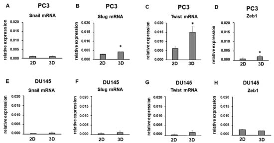 Snail, Slug, Twist and Zeb1 mRNA levels. Bar graphs showing Snail (A) and (E), Slug (B) and (F), Twist (C) and (G) and Zeb1 (D) and (H) mRNA levels in PC3 and DU145 cells grown in 2D-monolayers and 3D cell cultures. Data are means ± SD of duplicate samples. * p < 0.05 vs 2D-monolayer.
