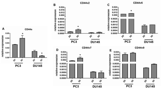CD44s and variants gene expression. Bar graphs showing CD44s (A), CD44v2 (B), CD44v6 (C), CD44v7 (D) and CD44v9 (E) gene expression in PC3 and DU145 cells grown in 2D-monolayers and 3D cell cultures. Data are means ± SD of duplicate samples. * p < 0.05 vs 2D-monolayer.
