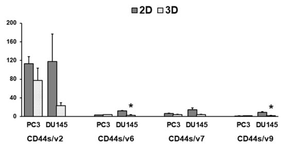 CD44s/CD44 variant in PC3 and DU145 cells. Bar graphs showing the CD44s/CD44 variant in PC3 and DU145 cells grown in 2D-monolayers and 3D cell cultures. Data are means ± SD of duplicate samples. * p < 0.05 vs 2D-monolayer.