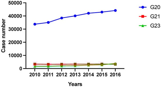 In 2010 a total number of 33,760 inpatient treatments were performed for primary Parkinson’s syndrome (G20). Treatment numbers increased up to 44,192 cases per year in 2016. Concerning secondary Parkinson’s syndromes (G21), treatment numbers decreased from 3388 in 2010 to 3271 cases in 2016. Case numbers of patients with other degenerative diseases of the basal ganglia (G23) more than doubled from 2010 (1749 cases) to 2016 (3858 cases), but represent only a minor part of all treatments (Figure 1).