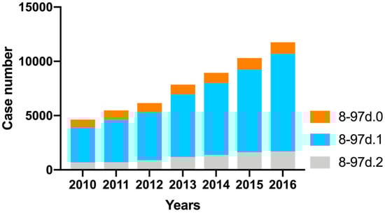 Case number development of PD-MCT from 2010 to 2016 divided into subcategories. 8–97d.0 = PD-MCT treatment of 7–13 days; 8–97d.1 = PD-MCT treatment of 14–20 days; 8–97d.2 = PD-MCT treatment of at least 21 days.