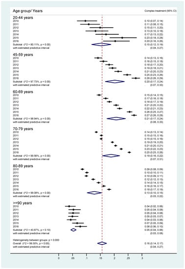 To assess for potential disparities between the predefined age groups, we plotted the relevant percentages and 95% confidence intervals (95% CI) for all outcomes of interest and for each consecutive year, stratified by the age group. Pooled overall estimates and age group estimates were calculated using the random-effects model. Given the expected heterogeneity both within and between groups, we also provided the corresponding 95% prediction intervals (95% PI) to allow for a better appreciation of the uncertainty around cumulative estimates. To evaluate for potential disparities with regard to existing fluctuations, we estimated odds ratios (ORs) with the corresponding 95% CIs for all outcomes of interest. Cumulative estimates were again provided using the random effects model. Both within and between group differences in all analyses were assessed with the Cochran’s test for heterogeneity. Analyses were performed with the Stata Statistical Software Release 13 (StataCorp LP, College Station, TX, USA).