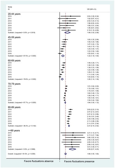 Interestingly, the odds ratio to receive PD-MCT with the presence of motor fluctuations was significantly higher for all age groups. It was particularly likely to be subjected to this therapy if motor fluctuations were present in the young (20–44 years) or those of older age (80–89 years and ≥ 90 years) (Figure 5).