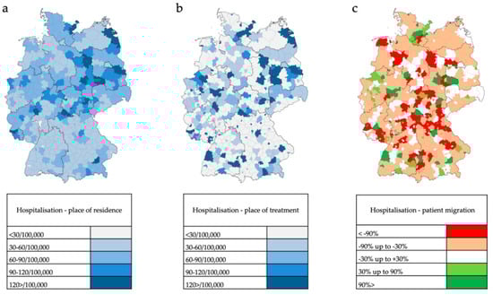 Patients who had been hospitalized and undergone a PD-MCT again lived relatively often in rural areas or in eastern and southeastern Germany (Figure 7a). The place of PD-MCT was even more pronouncedly concentrated in regional centers (Figure 7b, Figure 8). Relative migratory movements of patients for PD-MCT from their place of residence to treatment centers are depicted in Figure 7c.