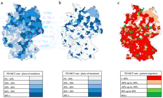 Inpatient PD-MCT in 401 administrative counties in Germany in the year 2016. (a) Ratio of PD-MCT to PD inpatients based on patients’ place of residence. (b) Ratio of PD-MCT to PD inpatients based on patients’ place of treatment. (c) Patient migration rate (G20+G21+G23) calculated as relative difference between patients’ place of residence and patients’ place of treatment of PD-MCT number. Values near to 0% indicate a balanced migration ratio. Values less than −30% indicate a distinct out-migration while values greater than +30% indicate a distinct immigration.