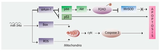The role of miR-34a in inducing apoptosis—miR-34a induces apoptosis by inhibiting Sirtuin-1. Sirtuin-1 attenuates apoptosis by: 1—Inhibiting p66, an activator of Akt; Akt phosphorylates FOXO to inhibit MnSOD, which usually inhibits apoptosis. 2—inhibiting the transcription of p53, which usually induces apoptosis. In addition, miR-34a leads to Bax upregulation and reactive oxygen species (ROS) accumulation, hence triggering the release of Cytochrome C from the mitochondria, which activates Caspase 3 to induce apoptosis. FOXO3: Forkhead box O3; MnSOD: Manganese Superoxide Dismutase; Akt: protein kinase B; cytc: Cytochrome c.