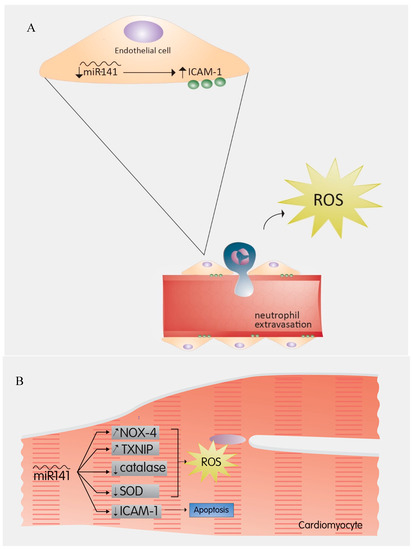 (A) miR-141 in endothelial cells: The downregulation of miR-141 and the subsequent upregulation of ICAM-1 results in increased extravasation of neutrophils, which release ROS and amplify necrosis. Hence miR-141 protects endothelial cells in Ischemia-Reperfusion injury. (B) Effects of miR-141 on cardiomyocytes: In cardiomyocytes, the upregulation of miR-141 leads to an increase in ROS by increasing the expression of ROS-generating agents such as NOX-4 and TXNIP, as well as decreasing the activity of antioxidants such as catalase and SOD. In addition, miR-141 silences ICAM-1 expression, hence the induction of apoptosis. ICAM-1: Intercellular Adhesion Molecule 1; NOX-4: NADPH Oxidase 4; TXNIP: Thioredoxin-Interacting Protein; SOD: Superoxide Dismutase.