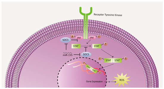 miR-155 role in increased ROS production: miR-155 increases ROS production by silencing SOCS, a negative regulator of the JAK/STAT signaling pathway, a pathway known to play a role in ROS generation. JAK: Janus kinase; STAT: signal transducer and activator of transcription. SOCS: suppressor of cytokine signaling.