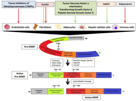 The MMPs are regulated at different levels: Gene expression, proteolytic activation of the proenzymes, inhibition of the catalytic activity by chemical and biological agents, and complexing with specific tissue inhibitors (TIMPs). MMPs are synthesized by different cells types such as endothelial cells, fibroblasts, adipocytes, hepatic stellate cells (HSC), and immune cells (Figure 2). In physiological conditions, they are expressed at some baseline levels but are differentially expressed in response to certain hormones, growth factors, and inflammatory and fibrogenic cytokines [], via the activation of MAPK, JNK, and NF-κB-dependent signaling pathways [].