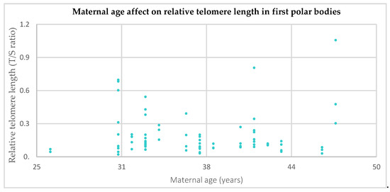 Our observation that advanced maternal age is not associated with a difference in the relative telomere length of first polar bodies is in line with previous observations using quantitative fluorescence in situ hybridization (QFISH) analysis in oocytes. Therefore, our analysis of relative telomere length in 82 polar bodies adds further weight to previous findings in a study that assessed 26 oocytes [23]. It is possible that this finding can be explained by the maintenance of telomere length in the oocyte by telomerase activity. Indeed, available data indicate that telomerase is expressed in the oocyte at all stages of oogenesis in humans [38] and other mammals [39,40]. Furthermore, it is also possible that telomere length could be maintained in the oocyte by homologous recombination-based telomere lengthening mechanisms, known as alternative lengthening of telomeres (ALT), though evidence to support this is currently lacking in the published literature.