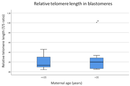 Results show that relative telomere length in blastomeres biopsied from cleavage stage embryos from couples in which women were 35 years old or under are shorter than those from couples in which women were over the age of 35 (0.13 compared to 0.2 respectively, Figure 3). However, this difference was not statistically significant (p = 1.0).
