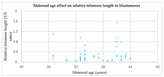 To confirm this finding, relative telomere length measured from each blastomere was plotted against maternal age (Figure 4). Results showed that, in line with results in Figure 3, no correlation existed between the two (r = 0.16, p = 0.14).