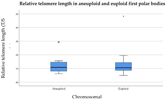 Relative telomere length of aneuploid first polar bodies (n = 12) in comparison to euploid first polar bodies (n = 12) assessed in all women. Results show no significant difference (p = 0.39). The line on the lower end of the whisker represents the minimum T/S ratio, the bottom of the box represents the first quartile, the line through the middle region of the box represents the median T/S ratio, the top of the box represents the third quartile, and the line at the top of the whisker represents the maximum T/S ratio. Circles represent outliers between 1.5 and 3 box lengths from the upper region of the box. Asterisks represent extreme outliers that are more than three times the interquartile range from the third quartile.