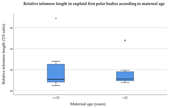 Relative telomere length of euploid first polar bodies in women aged 35 years or younger (n = 11) in comparison to woman over the age of 35 (n = 11). Results show no significant difference between the groups (p = 0.16). The line on the lower end of the whisker represents the minimum T/S ratio, the bottom of the box represents the first quartile, the line through the middle region of the box represents the median T/S ratio, the top of the box represents the third quartile, and the line at the top of the whisker represents the maximum T/S ratio. Circles represent outliers between 1.5 and 3 box lengths from the upper region of the box. Asterisks represent extreme outliers that are more than three times the interquartile range from the 3rd quartile.