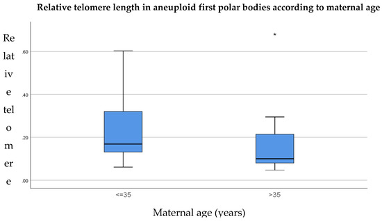 In order to test the hypothesis that telomere length is significantly shorter in the first polar bodies from women of advanced maternal age compared to their younger counterparts, relative telomere length was successfully assessed in 2–4 first polar bodies from the above cohort of women (Table S1). An average relative telomere length for all polar bodies assessed in each woman was calculated, and then the data was divided into two groups; those aged 35 or under, and those aged over 35 and therefore defined as being of advanced maternal age. The polar bodies assessed were made up of a mixture of both euploid and aneuploid samples. The data was analyzed for statistical significance using a Mann–Whitney test, and the results are summarized in Figure 1.