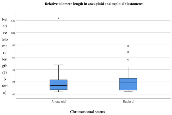 Relative telomere length of euploid (n = 21) and aneuploid (n = 21) blastomeres assessed from all couples. Results show no significant difference (p = 1.0). The line on the lower end of the whisker represents the minimum T/S ratio, the bottom of the box represents the first quartile, the line through the middle region of the box represents the median T/S ratio, the top of the box represents the third quartile and the line at the top of the whisker represents the maximum T/S ratio. Circles represent outliers between 1.5 and 3 box lengths from the upper region of the box. Asterisks represent extreme outliers that are more than three times the interquartile range from the third quartile.