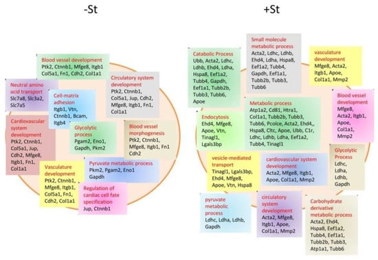 Schematic representation of protein content in EXOs from starved (+St), i.e., glucose-deprived, and non-starved (−St) CMs. CMs deprived of glucose change the protein pool contained in their EXOs, promoting their loading with proteins related to metabolic and catabolic processes, as well as blood vessel and cardiovascular development [].