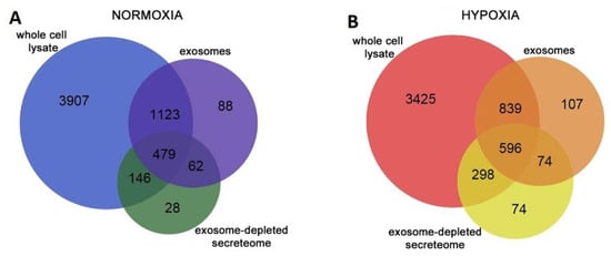Summary of proteomics data acquired using a multidimensional protein identification technology approach. Venn diagrams representing the overlap of protein identifications between cardiac fibroblast (CF) whole-cell lysate, exosome, and secretome collected in (A) normoxic conditions and (B) hypoxic conditions. The number of proteins contained in the three fractions changed depending on the culture conditions. Modified from Reference [].