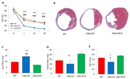 Involvement of microRNA (miR)-146a in the impairment of heart function after myocardial infarction (MI). (A) Measurement of left-ventricular ejection fraction indicates that 146a knockout (KO) animals have severely impaired cardiac function and structure following acute MI compared to wild-type (WT) or 146a KO-R mice. (B) Representative Masson’s trichrome-stained sections of hearts from three groups show the different tissue regeneration after MI. (C–E) Morphometric analysis reveals impairment of cardiosphere (CDC)-mediated benefits as evident in pooled data for scar mass, viable mass, and infarct wall thickness (IWT) in hearts of 146a KO mice. * p < 0.05, ¶ p < 0.05; ** p < 0.01, and ¶¶ p < 0.01, *** p < 0.001, and ¶¶¶ p < 0.001 using Student’s t-test (* KO versus WT; ¶ KO versus KO-R). Data are represented as means and standard errors of the mean (SEM). Modified from Reference [].