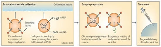 Engineering of extracellular vesicles (EVs). EVs can be engineered to load desired items, which can be carried out either endogenously or exogenously. Endogenous loading is achieved via transfecting parent cells strongly overexpressing miRNA or mRNA; this results in the production of EXOs that are already loaded with the elements of interest upon their collection. Exogenous loading allows the collection of drug-free EXOs which are then loaded with desired cargo molecules either via simple co-incubation with suitable cargo molecules or via active encapsulation with the help of certain procedures, such as electroporation. Modified from Reference [].