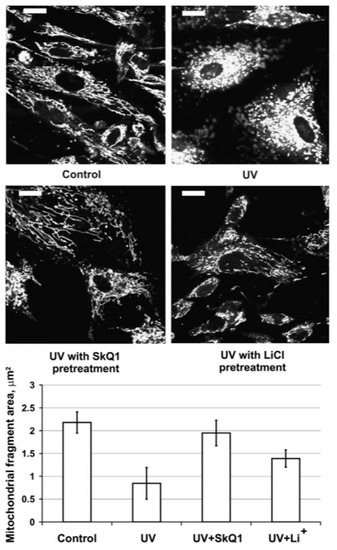 Mitochondrial fragmentation in 60-s UV-exposed fibroblasts (upper left, control culture; upper right, the same culture after exposure to UV). TMRE (200 nM) staining. The cells pretreated with 120 nM SkQ1 (for 5 days, bottom left) are fully protected while with 3 mM LiCl (bottom right) partially protected from UV-induced fragmentation. Bar, 20 μm. Diagram illustrates alterations of average mitochondria fragments size (area occupied by a single mitochondrial fragment) under these particular conditions. (From [38] with permission.)