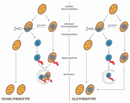 The mission of autophagy (mitophagy) is to reverse the balance to a normal one by the disposal of dysfunctional (or low-functional) mitochondria. These two elements (mitochondrial fragmentation and mitophagy) are the essence of the mitochondria quality control machinery which goal is to maintain a healthy (young) mitochondrial phenotype. What is important, after fragmentation mitophagy eliminates mitochondria harboring mtDNA mutations, and the remaining mitochondrial fragments undergo fusion. Thus, fission followed by mitophagy controls the process of reducing heterogeneity of mtDNA and reducing mitochondria heteroplasmy levels, thus pursuing the above-mentioned goal to maintain the native integrity of the mtDNA [55]. The impaired machinery of fission or/and mitophagy leads to the appearance of unhealthy (old) mitochondrial phenotype (Figure 5).