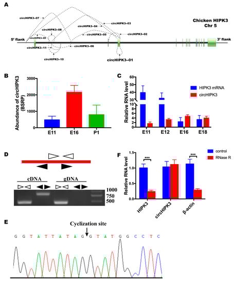 - Zheng, Q.; Bao, C.; Guo, W.; Li, S.; Chen, J.; Chen, B.; Luo, Y.; Lyu, D.; Li, Y.; Shi, G.; et al. Circular RNA profiling reveals an abundant circHIPK3 that regulates cell growth by sponging multiple miRNAs. Nat. Commun. 2016, 7, 11215. [Google Scholar] [CrossRef]