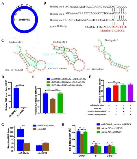 Many studies showed that circular RNAs exerted their functions by acting as the miRNA sponge. CircHIPK3 was predicted by miRDB and RNAhybrid to be a target of multiple miRNAs. Among these miRNAs, ggs-miR-30a-3p was chosen as a candidate because there were three potential binding sites in circHIPK3 (Figure 2A). The seed sequence of miR-30a-3p matched with three sites in circHIPK3 (Figure 2B). Besides, the prediction results from RNAhybrid indicated that the binding site 2 was the most stable format (Figure 2C). To identify the interactions between circHIPK3 and miR-30a-3p, the over-expression vector of circHIPK3 was constructed and transfected into DF-1 cells. The expression efficiency of the over-expression vector was detected by qPCR. Compared with the group transfected with pCD5ciR, the circHIPK3 over-expression vector expressed a higher level of circHIPK3 (Figure 2D). Then, circHIPK3 over-expression vector and miR-30a-3p mimic were co-transfected into DF-1 cells with a pmirGLO vector, containing the miR-30a sequence. Meanwhile, as the control group, the pCD5ciR and miR-30a-3p mimic (or mimic NC) were co-transfected with the pmirGLO vector, containing the miR-30a sequence. The results showed that the relative luminescence activity of the group with circHIPK3 over-expression vector and miR-30a-3p mimic was significantly higher than the group with pCD5ciR and miR-30a-3p mimic, but had no difference compared with the group pCD5ciR and mimic NC (Figure 2E). These results suggest that circHIPK3 could bind with miR-30a-3p mimic. In addition, sequences which contained binding site 2 or the mutated sequence were inserted into pmirGLO vector. Recombinant vectors with the wild type sequence was then co-transfected into DF-1 cells with miR-30a-3p mimic, meantime, three control groups were set (pmirGLO vector with mutated sequence and miR-30a-3p mimic, pmirGLO vector with wild type sequence and mimic NC, pmirGLO vector with mutated sequence and mimic NC). The results showed that the relative luminescence activity of the group with a wild-type plasmid and mimic was significantly decreased compared to the group transfected with mutated plasmid and mimic, and the group with wild type plasmids and mimic NC (Figure 2F). Moreover, the RNA level of circHIPK3 was significantly down-regulated after over-expression of miR-30a-3p mimic, compared to the group transfected with mimic NC (Figure 2G). Subsequently, the result of flow cytometry analysis showed that miR-30a-3p could reverse the effect of circHIPK3 on a cell cycle (Figure 2H). Altogether, these results indicated that miR-30a-3p could interact with circHIPK3.