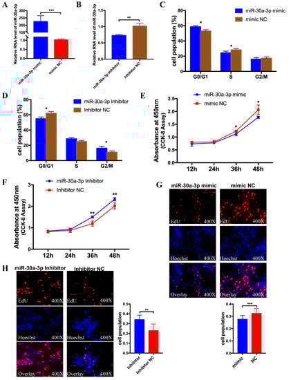 miR-30a-3p inhibits myoblast proliferation. (A,B) The over-expression and inhibitory effects of miR-30a-3p mimic and inhibitor in CPMs. (C,D) Effect of miR-30a-3p mimic and inhibitor on cell-cycle progression of chicken primary myoblasts (CPMs). The plot of cell-cycle analysis in different cell-cycle phases was compared. (E,F) The growth curves of CPMs were measured after the transfection of miR-30a-3p mimic and inhibitor. (G,H) 5-Ethynyl-2′-Deoxyuridine (EdU) assays for CPMs with over-expression and inhibition of miR-30a-3p. In all panels, values represent mean ± SEM from three independent experiments. * p < 0.05; ** p < 0.01; *** p < 0.001.