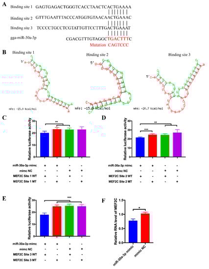 MEF2C is a target gene of miR-30a-3p. (A) The potential binding site sequence of miR-30a-3p on MEF2C. The seed sequences and mutant sequences were highlighted in red. (B) The potential interaction model between miR-30a-3p and MEF2C from RNAhybrid. (C–E) Luminescence was measured after co-transfecting wild type or mutant sequence of MEF2C with miR-30a-3p mimic (or mimic NC) in DF-1 cells. (n = 6). (F) The RNA level of MEF2C from miR-30a-3p mimic transfected CPMs. In all panels, values represent mean ± SEM from three independent experiments. * p < 0.05; ** p < 0.01; *** p < 0.001.