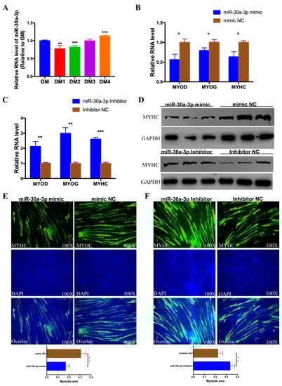 miR-30a-3p represses CPM differentiation. (A) The expression profile of miR-30a-3p in the process of CPMs induced differentiation. (B) The expression of MYOD, MYOG and MYHC in CPMs after over-expression of miR-30a-3p. (C) The expression of MYOD, MYOG and MYHC in CPMs after knock-down of miR-30a-3p. (D) The protein level of MYHC in CPMs after over-expression and knock-down of miR-30a-3p. (E) Immunofluorescence analysis of MYHC-staining cells after over-expression miR-30a-3p in CPMs. (F) Immunofluorescence analysis of MYHC-staining cells after knock-down of miR-30a-3p in CPMs. * p < 0.05; ** p < 0.01; *** p < 0.001.