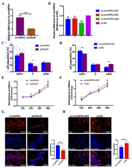 circHIPK3 promotes the proliferation of CPMs. (A) The over-expression effect of circHIPK3 over-expression vector in CPMs. (B) The interference effects of three siRNAs of circHIPK3 in CPMs. (C,D) Effect of circHIPK3 on cell-cycle progression of CPMs. The plot of cell-cycle analysis in different cell-cycle phases was compared. (E,F) The growth curves of CPMs were measured after the transfection of over-expression vector and siRNA of circHIPK3. (G,H) EdU assays for CPMs with over-expression and inhibition of circHIPK3. In all panels, the values represent mean ± SEM from three independent experiments. * p < 0.05; ** p < 0.01; *** p < 0.001.