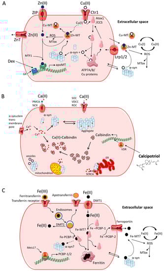 Interactions between metal ion homeostatic mechanisms and α-syn aggregation. (A) Cu homeostasis, α-syn and metallothionein (MT) induction. Cu enters via CTR1, then transfers to either Atox1 or CCS transporters that shuttle Cu to either ATP7A/B pumps or SOD1, respectively. MT may buffer labile Cu that spills over from these pathways. Cu binding to α-syn can induce aggregation. Zn-MT can remove Cu from α-syn. MT is also a potent ROS scavenger. Both MT and α-syn can be secreted by and taken up by cells. MT transcription is induced by MTF1 in response to Zn and by glucocorticoids via the glucocorticoid receptor. The glucocorticoid analogue, dexamethasone, induces MT and can block Cu-dependent α-syn aggregation. MTF1, metal-responsive transcription factor-1; MTox, oxidized MT; Dex, dexamethasone; GR, glucocorticoid receptor; ZnT, zinc transporter; CTR-1, copper transporter 1; CuMT, copper MT; apoMT, metal-free MT; Lrp1/2, Low density lipoprotein receptor-related protein 1/2; ZIP, zinc importer protein. (B) Ca homeostasis, α-syn and calbindin-D28k induction. Ca enters via ligand and voltage-gate channels and is rectified by plasma membrane pumps. Ca binding to α-syn leads to aggregation and enhances vesicle interactions. Aggregated α-syn can also allow Ca entry and stimulate Ca release from the ER and mitochondria. CB buffers intraneuronal Ca and is upregulated by the vitamin D receptor. The vitamin D analogue, calcipotriol, can induce CB and block Ca-dependent α-syn aggregation. PMCA, plasma membrane calcium channel; NCX, sodium/calcium exchanger; SOC, store-operated channel; VDCC, voltage-dependent calcium channel; ROC, receptor-operated channel; VDR, vitamin-D receptor; SERCA, sarco/endoplasmic reticulum calcium channel. (C) Fe homeostasis, intracellular transporters, and possible α-syn interactions. Fe enters via transferrin/transferrin receptor or via DMT1 and can leave via ferroportin. Endocytosed ferritransferrin releases Fe(II) via DMT1. PCBP-1 transports Fe to be stored in ferritin. Fe accumulation may lead to interactions, such as with α-syn or MT. Fe release from ferritin and/or transferrin may also be inhibited by α-syn. PCBP-1/2 induction, such as by Meis1, may combat Fe accumulation. DMT1, divalent metal-ion transporter 1; PCBP1, poly (rC)-binding protein 1. Dashed arrows indicate tentative pathways.
