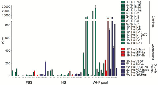 Bio-plex analysis of fetal bovine serum, human serum, and wound healing fluid composition. Concentration (pg/mL) of 25 molecules is shown. Level of cytokines, chemokines, and growth factors, was assessed by Bio-plex assay in fetal bovine serum (FBS), human serum (HS), and a pool of five wound healing fluids from breast cancer surgery (WHF Pool) (mean ± SD).