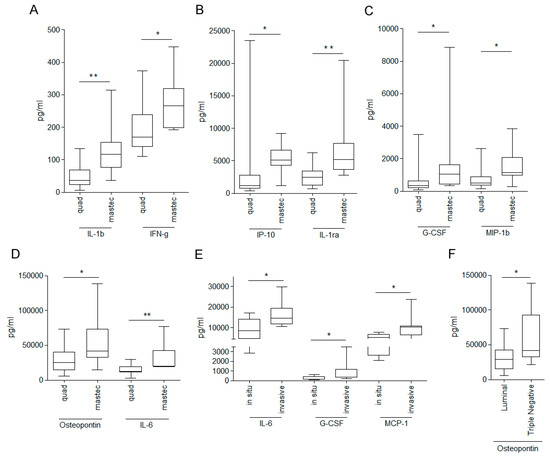 Differences in small-molecule composition of wound healing fluid from breast carcinoma surgery according to type of surgery, tumor histology, and tumor molecular subtype. Concentration (pg/mL) of 34 molecules, including cytokines, chemokines, and growth factors (listed in Material and Methods), was assessed by Bio-plex assay in 27 wound healing fluids from breast cancer patients. Levels of small molecules were differentially enriched by surgery (A–D), tumor histology (E), and tumor molecular subtype (F) (* p-value ≤ 0.05; ** p-value ≤ 0.01; Mann–Whitney test).