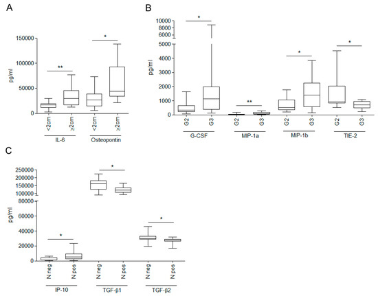 Differences in small-molecule composition of wound healing fluid from breast carcinoma surgery according to tumor size, tumor grade, and lymph node positivity. Concentration (pg/mL) of 34 molecules, including cytokines, chemokines, and growth factors (listed in Material and Methods), was assessed by Bio-plex assay in 27 wound healing fluids from breast cancer patients. Levels of small molecules were differentially enriched by breast cancer size (A), tumor grade (grade II (G2); grade III (G3) (B), and lymph node (C) (* p-value ≤ 0.05; ** p-value ≤ 0.01; Mann–Whitney test).