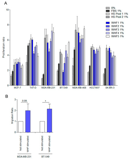 Effect of WHF on breast cancer cell proliferation and migration. (A) MCF-7, T-47D, MDA-MB-231, BT-549, MDA-MB-468, HCC1937, and SK-BR-3 breast cancer cell lines were starved for 24 h (0% FBS) and then treated for 96 h with 1% FBS or 1% of pools of human serum from breast cancer patients or 1% of five WHFs. Relative 2D-cell growth was measured by sulforhodamine B (SRB) assay. The ability of WHF to induce proliferation was indicated as the optical density (OD) of each cell line after four days of treatment (96 h) normalized on the OD of the same cell line measured immediately before starting the treatments. 0% represents the growth index of cells cultured for four days in absence of WHF or FBS or serum from breast cancer patients (HS Pool) (mean ± SD). (B) MDA-MB-231 and BT-549 cells were starved for 48 h (0% FBS) and then treated for 2 h with a pool of five WHFs and plated into Boyden chambers for migration assay toward FBS 10%. The area occupied by migrated cells in the Transwell was evaluated by digital image analysis (Image ProPlus 7.0 application, Media Cybernetics). Results are expressed as area occupied by cells on the bottom of the Transwell by digital image analysis (mean ± SEM; * p-value < 0.05; paired student’s t-test).