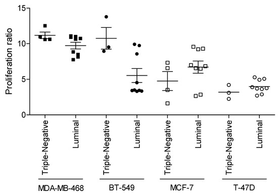 To determine whether the WHF from breast tumor surgery for various molecular subtypes of tumors preferentially affects the proliferation of cancer cells with the same molecular characteristics, the TN luminal breast cancer cell lines MDA-MB-468 and MCF-7 were stimulated as described with WHF from TN or luminal breast cancer surgery, and proliferation was evaluated by SRB assay (Figure 5). In addition to the difference in intrinsic proliferation rate between the cell lines—the proliferation rate of MDA-MB-468 cells was higher than that of T-47D cells, as expected—the proliferation of MDA-MB-468 and BT-549 cells increased primarily by WHF from the surgical removal of TN versus luminal breast tumors. Similarly, the proliferation of MCF-7 and T-47D that was induced by luminal-derived WHF was greater than that by TN breast tumors. These data support our hypothesis that tumors per se can modify their environment to favor their progression.